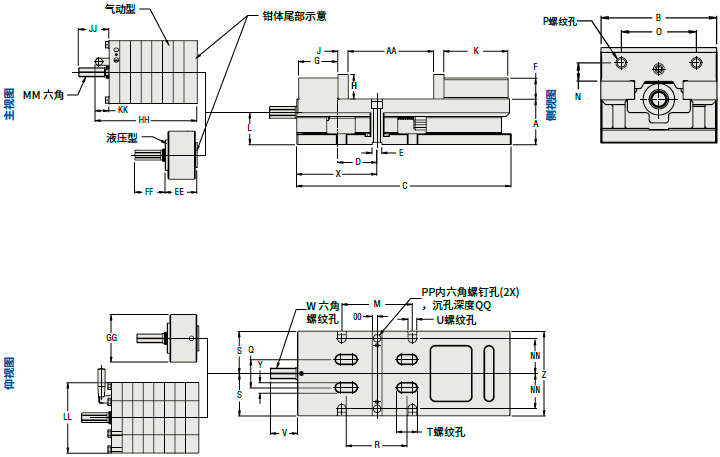 此型鉗除了具有標準多功能平口鉗的特點外,更具獨特 性。Y軸是正向,易于編程。定鉗在手柄一側(cè),操作者在裝卸 工件時更安全、簡捷、迅速。